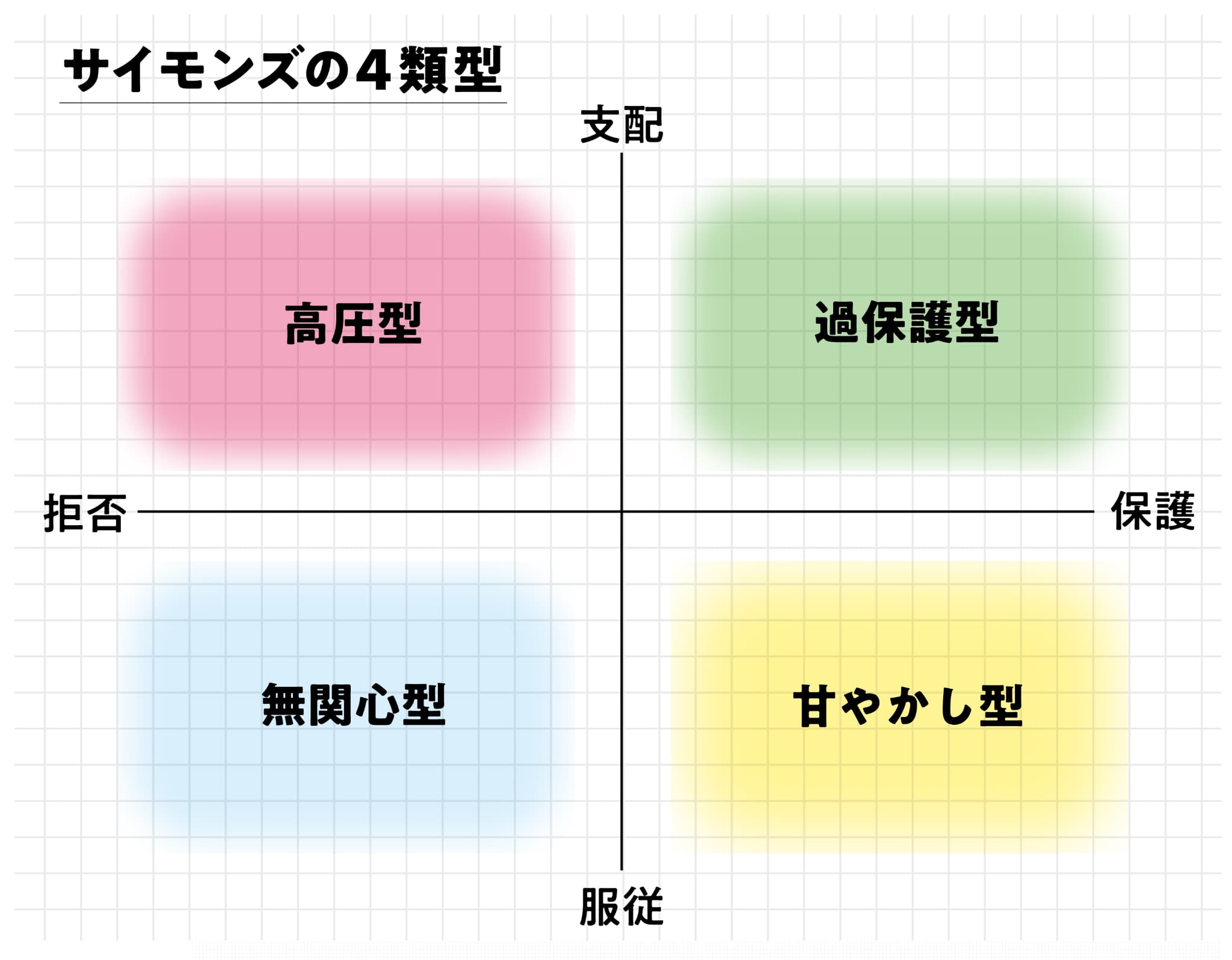 保護者が子どものどんなところに注意するべきかを考える上では、心理学者のサイモンズが考案した「養育態度の4タイプ」を意識するといいでしょう。これは、子育ての態度や行動を「過保護型」「高圧型」「甘やかし型」「無関心型」という4つのタイプに分類した考え方で、自分がどれに当てはまるのか、まずは親自身が自分を知ることがポイントになります。