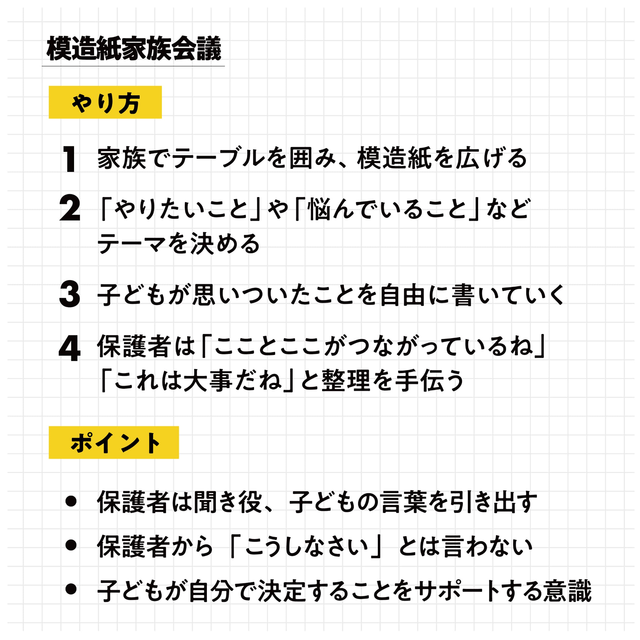 親子の関係づくりをする上でヒントになりそうなのが、出口さんが自身の家庭内で実践してきた「模造紙家族会議」だ。進路の選択など家庭内の重要なテーマを話し合う際に役に立っていたという。